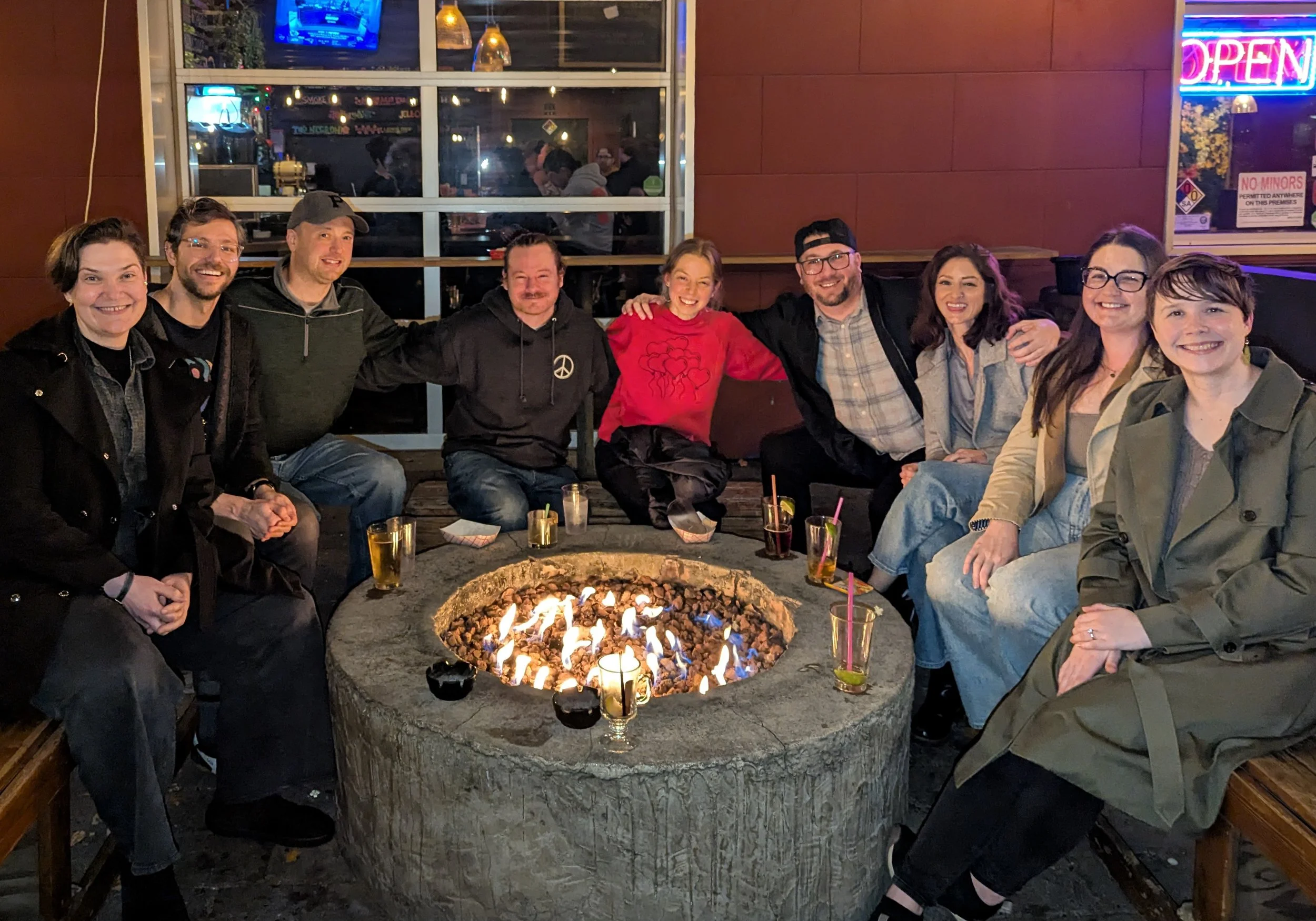 A mixed gender group of type 1 diabetics sitting around a fire pit smiling